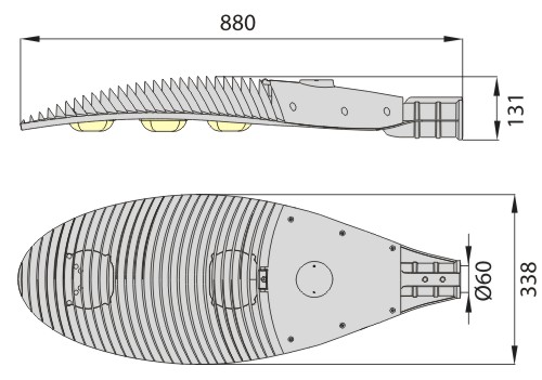 - montaż: na wysięgniku poziomym o średnicy 50 ÷ 60mm; możliwość montażu na pionowym słupie za pomocą regulowanego uchwytu U-2, umożliwiającego zmianę kąta nachylenia oprawy co 5o w zakresie -10o/+20o względem płaszczyzny drogi lub innej powierzchni oświetlanej (uchwyt U-2 dostępny jako akcesoria dodatkowe)